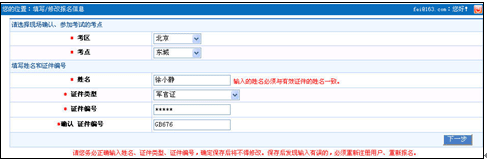 今年新報(bào)名考生在“填寫/修改報(bào)名信息”頁面需選擇“考區(qū)”、“考點(diǎn)”,并填寫正確的“姓名”、“證件類型”及“證件編號(hào)”。