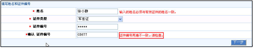 若您在“確認(rèn)證件編號(hào)”一欄與“證件編號(hào)”一欄所填的證件編號(hào)不一致時(shí),系統(tǒng)會(huì)進(jìn)行校驗(yàn)并給予提示。見下圖:
