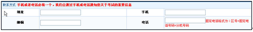 B、 聯(lián)系方式,聯(lián)系方式中,手機(jī)或電話必須填寫任意一項(xiàng),請(qǐng)確保聯(lián)系方式完整、有效,考試主管部門可能通過此聯(lián)系方式通知您考試相關(guān)的重要信息,若因聯(lián)系方式無效,導(dǎo)致的不良后果,考生自行負(fù)責(zé);