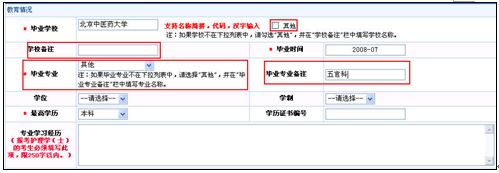 畢業(yè)專業(yè),若選項(xiàng)中不存在欲選專業(yè),請(qǐng)選擇“其他”,在畢業(yè)專業(yè)備注欄填寫專業(yè)名稱,請(qǐng)保持與畢業(yè)證書上的名稱一致,若有特殊情況必須在“畢業(yè)專業(yè)備注”中注明。