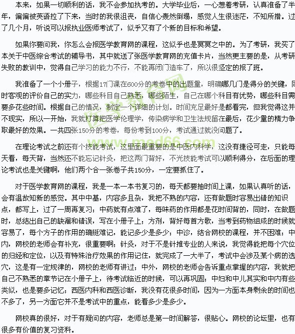 編者按:醫(yī)學(xué)教育網(wǎng)“我的醫(yī)考之路”大型征文活動中很多的學(xué)員踴躍參加,中醫(yī)執(zhí)業(yè)醫(yī)師學(xué)員根據(jù)自己2010年的醫(yī)師考試經(jīng)歷,記錄下:我的醫(yī)考之路——收獲的日子: