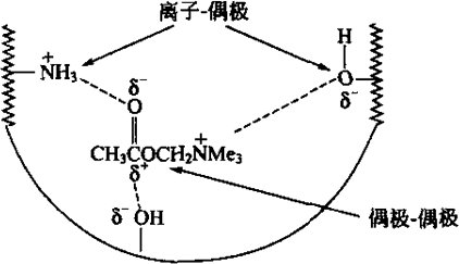 在藥物和受體分子中,當碳原子和其他電負性較大的原子,如N、O、S、鹵素等成鍵時,由于電負性較大原子的誘導作用使得電荷分布不均勻,導致電子的不對稱分布,產生電偶極。藥物分子的偶極受到來自于生物大分子的離子或其他電偶極基團的相互吸引,而產生相互作用,這種相互作用對穩(wěn)定藥物受體復合物起到重要作用,但是這種離子-偶極、偶極-偶極的作用比離子產生的靜電作用要弱得多。離子-偶極、偶極-偶極相互作用的例子通常見于羰基類化合物,如乙酰膽堿和受體的作用。