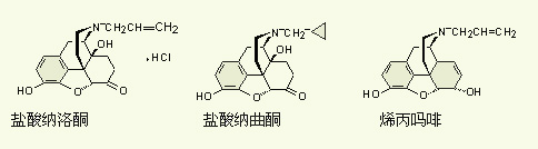 在具有剛性結(jié)構(gòu)的嗎啡、嗎啡喃類、苯嗎喃類、14-羥基二氫嗎啡酮等分子中,將氮原子上的甲基以3~5個(gè)碳的取代基,例如:烯丙基(allyl),環(huán)丙烷甲基(cyclopropylmethyl,CPM)或環(huán)丁烷甲基(cyclobutylmethyl,CBM)等取代,可得到阿片受體拮抗劑(Opioid antagonists)或混合的激動(dòng)拮抗劑,而用這些基團(tuán)取代哌替啶或美沙酮結(jié)構(gòu)中的N-甲基時(shí)不能得到拮抗劑。鹽酸納洛酮(Naloxone Hydrochloride)是以蒂巴因?yàn)樵习牒铣傻玫?。為阿片受體純拮抗劑,可有效的拮抗具有激動(dòng)活性或混合的激動(dòng)-拮抗活性的阿片樣鎮(zhèn)痛藥的作用,臨床用于此類藥物過(guò)量時(shí)引起的呼吸抑制的解救。以環(huán)丙烷甲基代替納洛酮結(jié)構(gòu)中17-烯丙基,得到納曲酮(Naltrexone)為純拮抗劑,但作用時(shí)間較納洛酮長(zhǎng),作用較強(qiáng)。烯丙嗎啡(Nalorphine)是較早用于臨床的嗎啡中毒解救藥,具有激動(dòng)-拮抗雙重活性,成癮性小,在它的啟發(fā)下發(fā)展了具有激動(dòng)-拮抗雙重作用的拮抗性鎮(zhèn)痛藥。