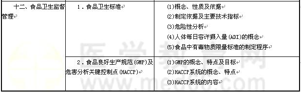 | 3.加工食品的衛(wèi)生及管理 | (1)酒的分類、衛(wèi)生問題及處理 (2)食用油脂的衛(wèi)生問題及處理 (3)罐頭食品的衛(wèi)生問題及處理 (4)轉基因食品的概念 | |