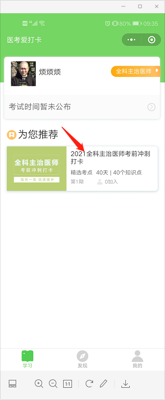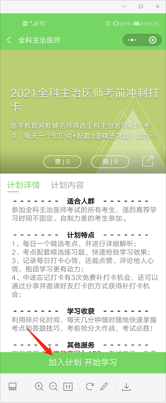 第三步:請(qǐng)選擇“您的備考計(jì)劃”,如“2021全科主治醫(yī)師考前沖刺打卡”,點(diǎn)擊下方“加入計(jì)劃開始學(xué)習(xí)”