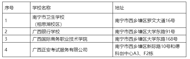本次考試南寧市考點(diǎn)共設(shè)4個(gè)考場,請考生認(rèn)真核對準(zhǔn)考證上的考試時(shí)間、考場名稱和地址,提前了解考場位置,充分考慮考試當(dāng)天交通、天氣等因素,提前做好出行路線規(guī)劃,以免遲到耽誤考試。建議考生至少考前1小時(shí)到達(dá)考場,具體考場名稱和地址如下表。