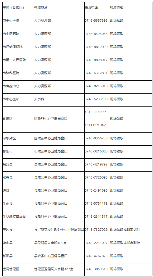2.領(lǐng)取地點:各市直屬醫(yī)療衛(wèi)生單位人力資源部,各縣市區(qū)(管理區(qū))政務(wù)中心衛(wèi)健局窗口或衛(wèi)健局人事股(詳見下表)。