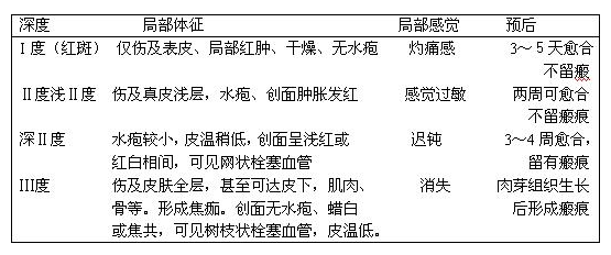 燒傷深度一般采用三度四分法,即Ⅰ度、Ⅱ度(又分淺Ⅱ度、深Ⅱ度)、Ⅲ度燒傷。