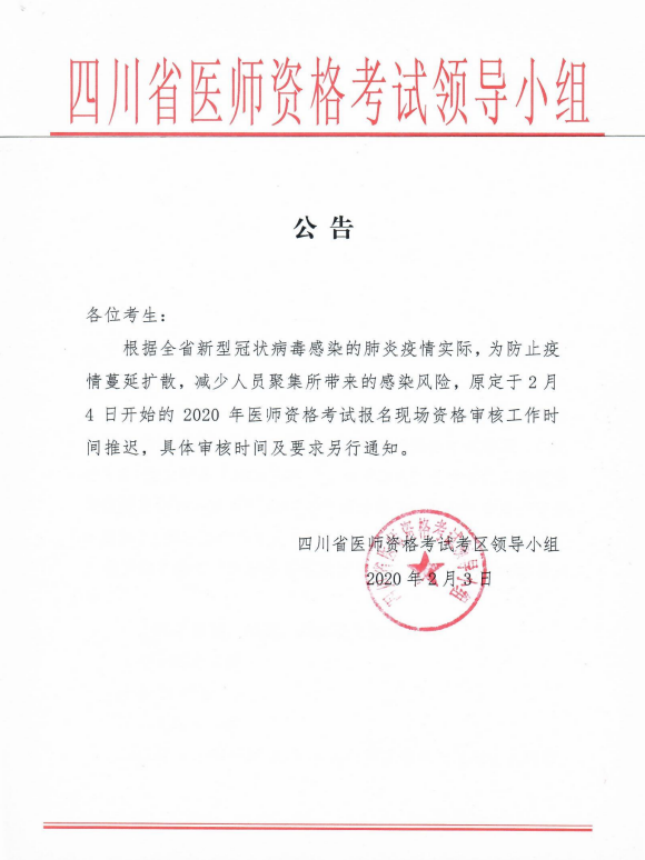 根據(jù)國家醫(yī)師考試委員會辦公室和四川省醫(yī)師資格考試領導小組公告要求,原定于2月12日開始的2020年醫(yī)師資格考試報名現(xiàn)場資格審核工作時間推遲,具體審核時間及要求另行通知。請各位考生關注資陽市衛(wèi)生健康委網(wǎng)站公告。