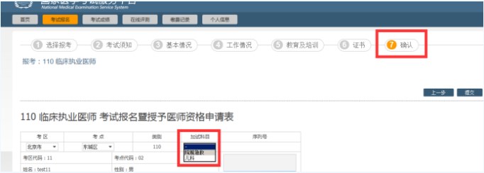 答:報考臨床執(zhí)業(yè)醫(yī)師且在院前急救或兒科崗位的考生可以申請參加短線醫(yī)學(xué)專業(yè)加試,網(wǎng)上填報時,在報名的第七步確認(rèn)時,在表中選院前急救或兒科加試。參加短線醫(yī)學(xué)專業(yè)加試的考生,如通過加試獲得醫(yī)師資格,限定在加試的專業(yè)或崗位范圍內(nèi)執(zhí)業(yè),如需變更執(zhí)業(yè)范圍需重新參加醫(yī)師資格考試獲取醫(yī)師資格。如下圖:
