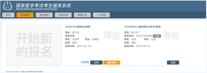 答:如需修改個人報名信息,須在網(wǎng)上報名截止日前,再次登陸服務(wù)平臺,進(jìn)入“考試報名”欄目,在需要修改的報名下方點(diǎn)擊“重新報考”,然后再重新報名,報名成功后需重新打印《醫(yī)師資格考試報名暨授予醫(yī)師資格申請表》。如下圖: