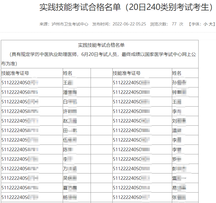 6月20日瀘州考點(diǎn)2022年醫(yī)師資格實(shí)踐技能考試(240類(lèi)別考生)成績(jī)通過(guò)名單