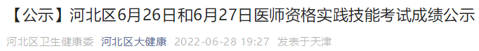 天津河北區(qū)考點2022年6月26日、27日醫(yī)師資格實踐技能考試成績公示