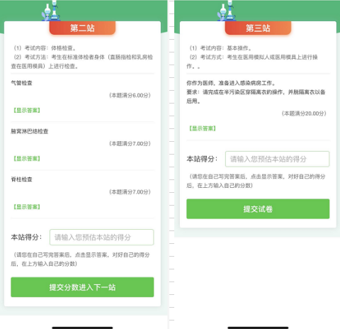 第一站試題做完后填寫預(yù)估的分?jǐn)?shù)就會進(jìn)入第二站的試題,第二站做完后提交預(yù)估分?jǐn)?shù)進(jìn)入第三站的試題,三站都完成練習(xí)后會生成考試成績!