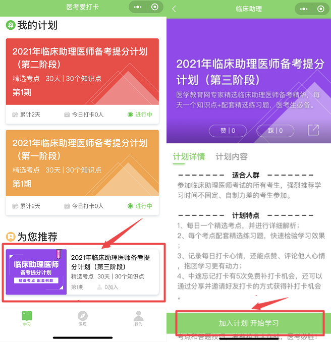 第三步:選擇備考科目后即進(jìn)入學(xué)習(xí)計(jì)劃選擇的頁(yè)面,請(qǐng)選擇“您的備考計(jì)劃”,如臨床助理醫(yī)師備考**計(jì)劃(第三階段),然后點(diǎn)擊下方“加入計(jì)劃 開始學(xué)習(xí)”按鈕,開始正式進(jìn)入打卡學(xué)習(xí)。