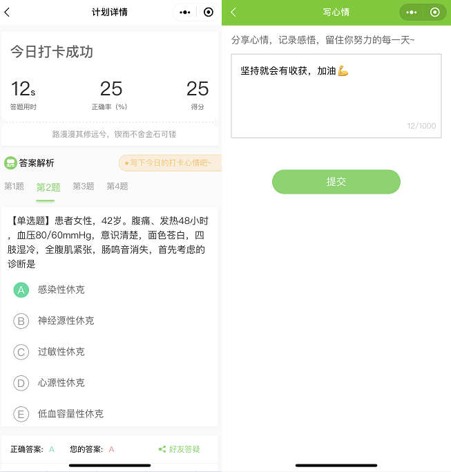 (3)查看測(cè)試結(jié)果+答案解析+分享今日打卡心情,提交完成打卡