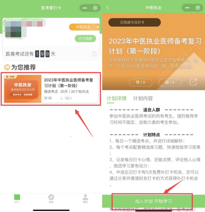 請選擇“您的備考計劃”,如中醫(yī)執(zhí)業(yè)醫(yī)師備考復習計劃(第一階段),然后點擊下方“加入計劃開始學習”按鈕,開始正式進入打卡學習;