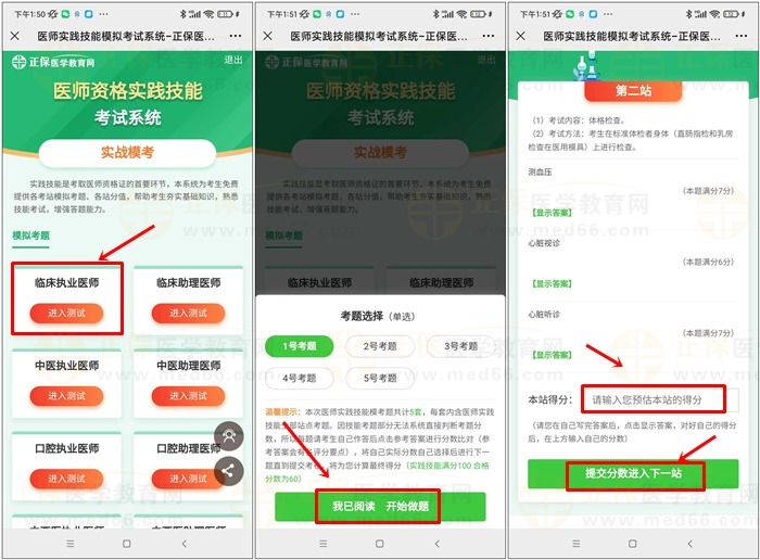 第一站試題做完后填寫(xiě)預(yù)估的分?jǐn)?shù)就會(huì)進(jìn)入第二站的試題,第二站做完后提交預(yù)估分?jǐn)?shù)進(jìn)入第三站的試題,三站都完成練習(xí)后會(huì)生成考試成績(jī)!臨床執(zhí)業(yè)醫(yī)師總共有5套試題供練習(xí)!