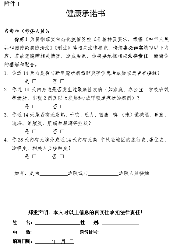 考前須知:所有考生就本人近14天的健康狀況和行程向各考試基地做出書面承諾,同時(shí)根據(jù)需要,考試當(dāng)日對(duì)所有考生查驗(yàn)48小時(shí)內(nèi)核酸檢測陰性證明、健康碼和行程碼。