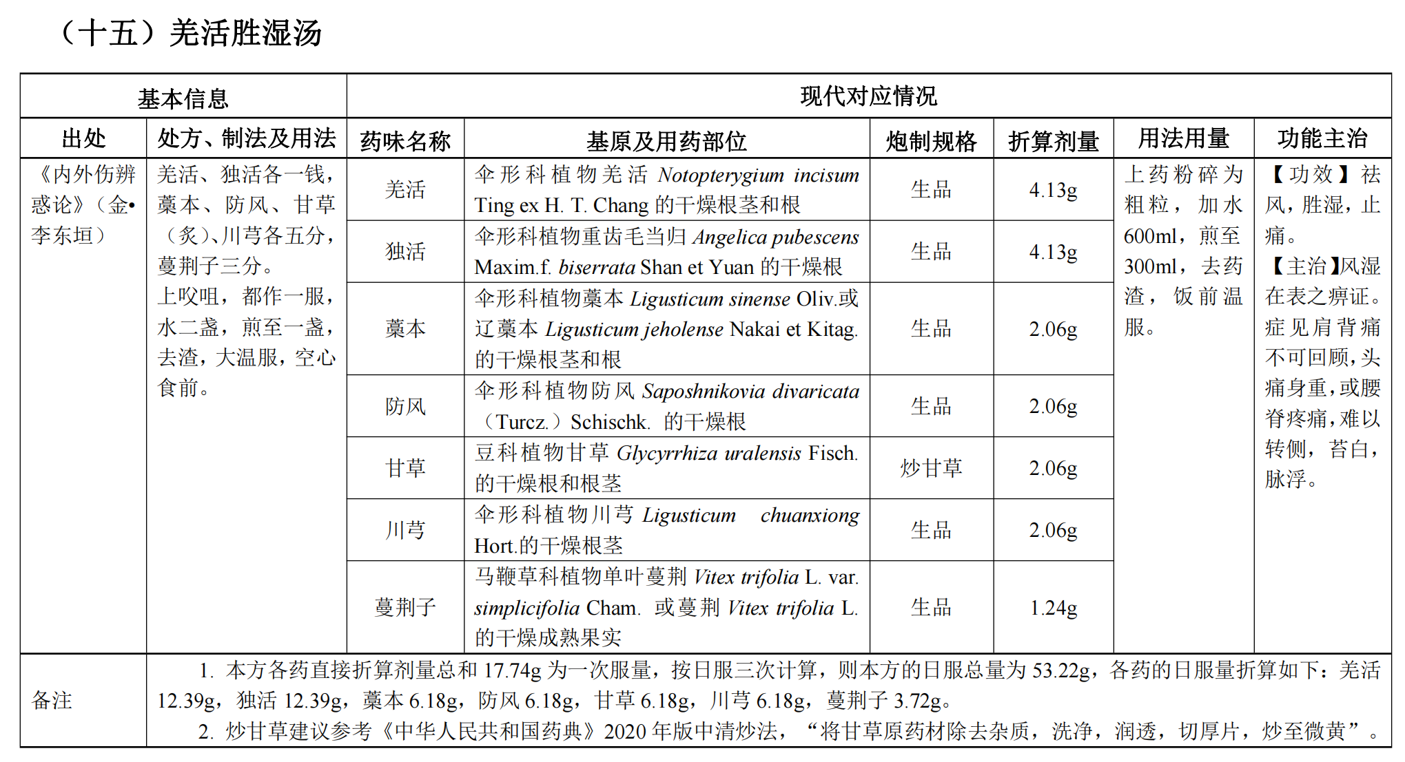 《古代經(jīng)典名方關(guān)鍵信息表(25首方劑)》——羌活勝濕湯