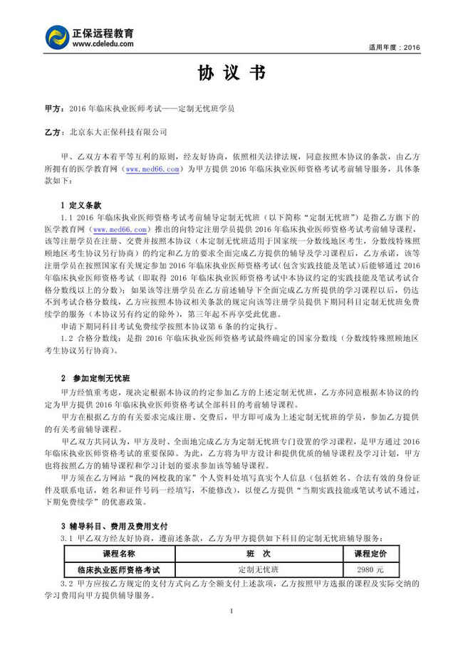 臨床執(zhí)業(yè)醫(yī)師“定制無憂班”協(xié)議書