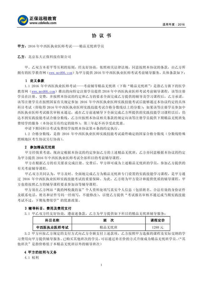 中西醫(yī)結(jié)合執(zhí)業(yè)醫(yī)師“精品無憂班”協(xié)議書