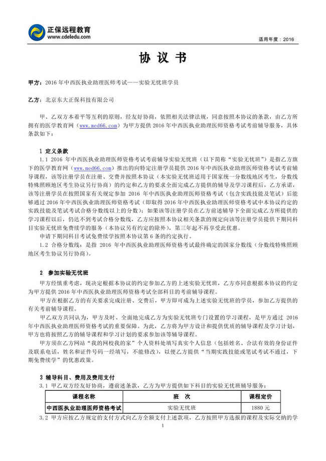 中西醫(yī)結合執(zhí)業(yè)助理醫(yī)師“實驗無憂班”協(xié)議書