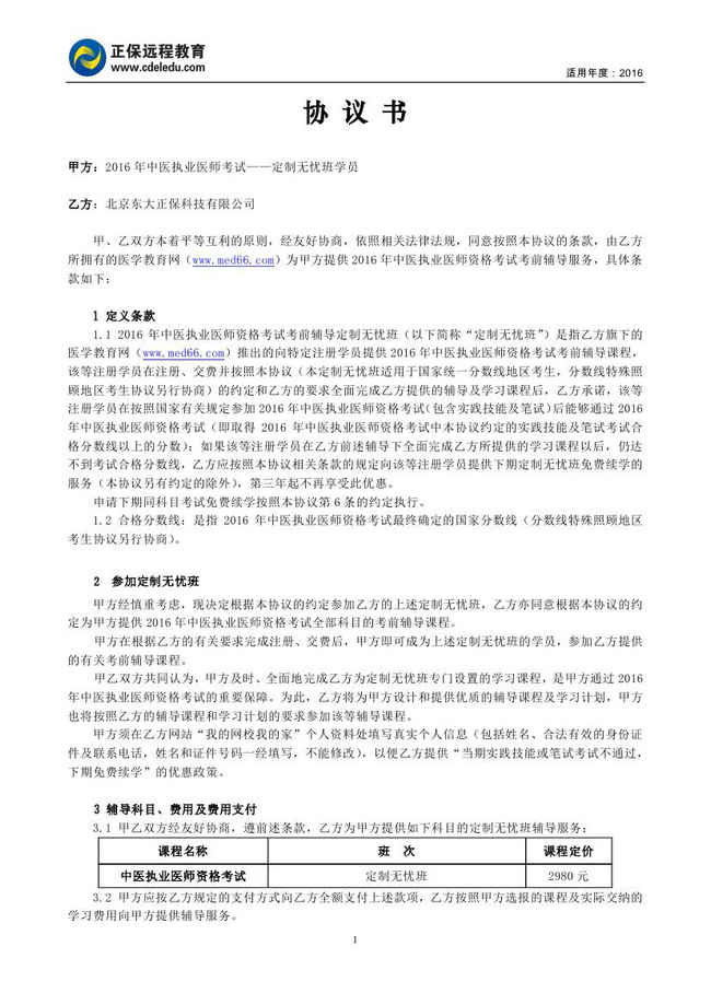 中醫(yī)執(zhí)業(yè)醫(yī)師“定制無(wú)憂班”協(xié)議書(shū)