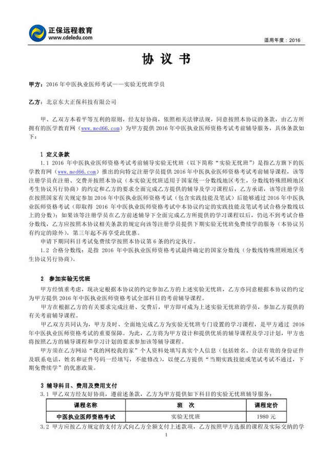 中醫(yī)執(zhí)業(yè)醫(yī)師“實驗無憂班”協(xié)議書