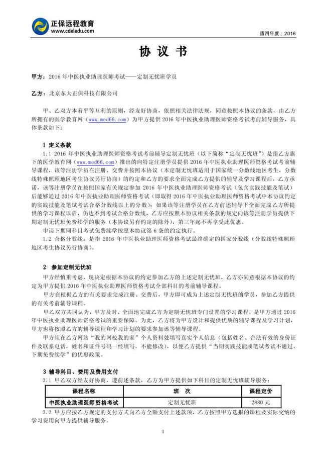 中醫(yī)執(zhí)業(yè)助理醫(yī)師“定制無憂班”協(xié)議書