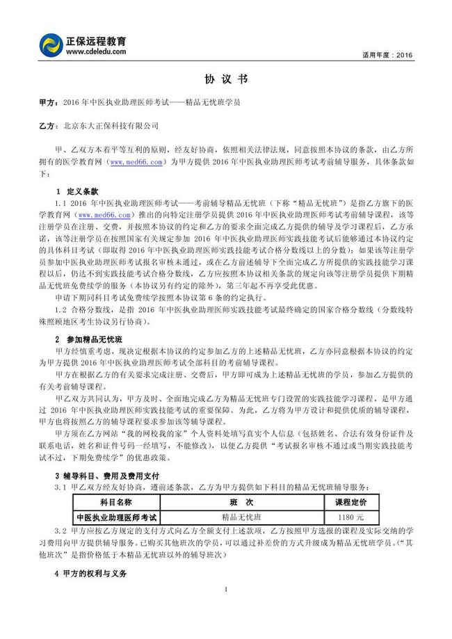 中醫(yī)執(zhí)業(yè)助理醫(yī)師“精品無憂班”協(xié)議書