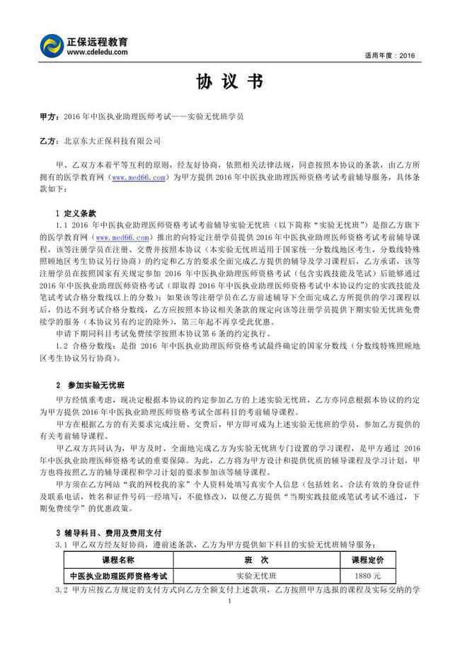 中醫(yī)執(zhí)業(yè)助理醫(yī)師“實驗無憂班”協(xié)議書