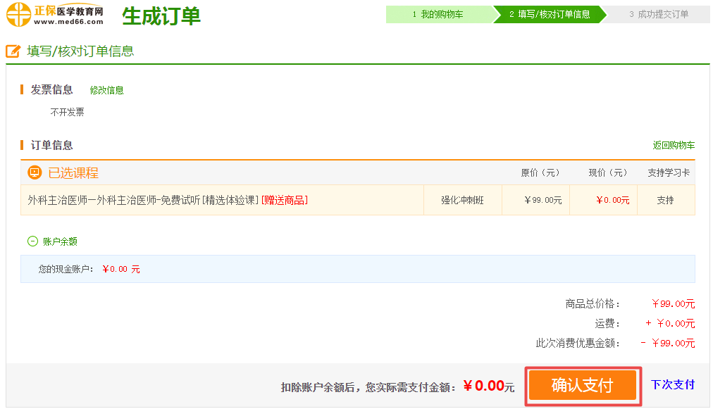 第二步:提交訂單,確認(rèn)支付“0元”;