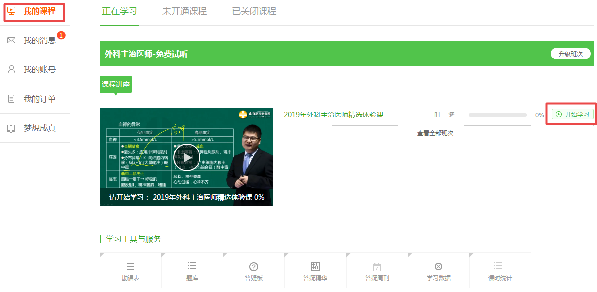 第三步:進(jìn)入“我的網(wǎng)校我的家”,查看“我的課程”,點(diǎn)擊開(kāi)始學(xué)習(xí),就可以按照課程目錄學(xué)習(xí)啦!