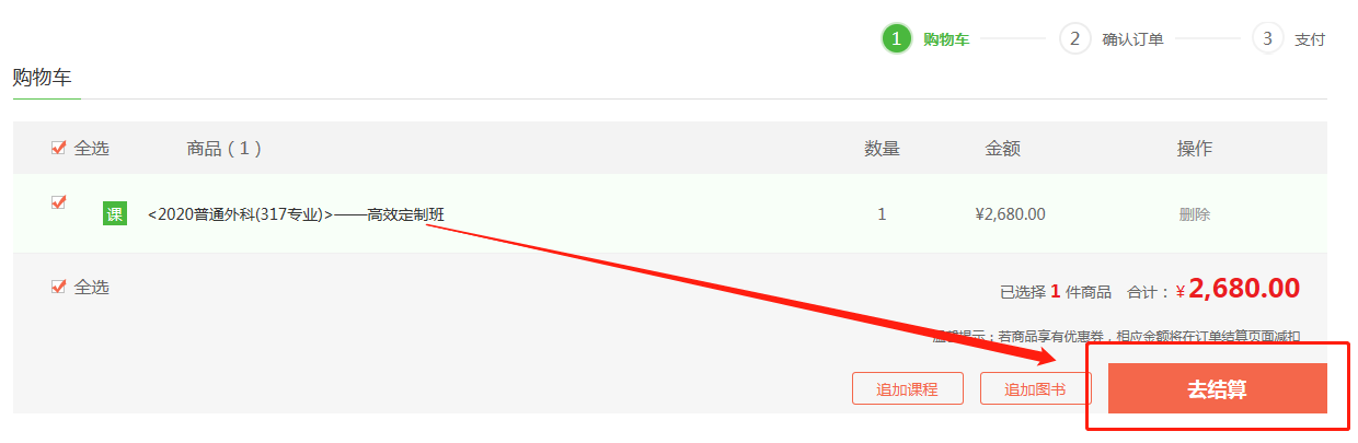 在購(gòu)物車(chē)內(nèi)確認(rèn)已選課程,確認(rèn)無(wú)誤后點(diǎn)擊“去結(jié)算”;