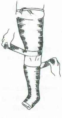 操作:仰臥抬高患肢,在大腿根部扎止血帶,從足趾向腘窩纏第1根彈力繃帶,從止血帶向下纏第2根彈力繃帶,讓患者站立,一邊向下解開(kāi)第1根繃帶,一邊向下纏第2根繃帶
