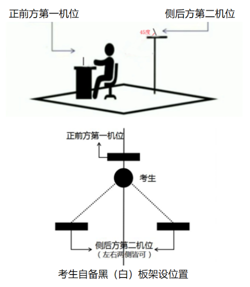 為保證考試效果,建議考生使用1.7米手機支架固定副手機。雙機位示意圖如下: