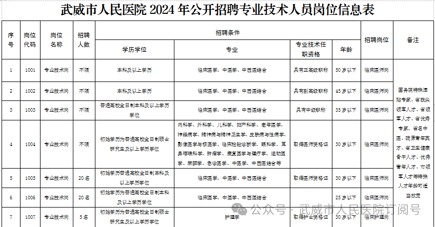 詳見《武威市人民醫(yī)院2024年公開招聘專業(yè)技術(shù)人員崗位信息表》