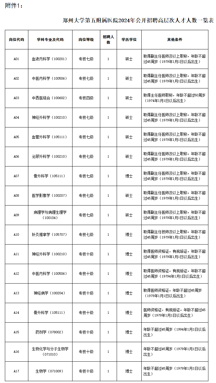 招聘人數(shù)共17名,具體崗位專業(yè)詳情見附表一:《鄭州大學(xué)第五附屬醫(yī)院2024年公開招聘高層次人才人數(shù)一覽表》。