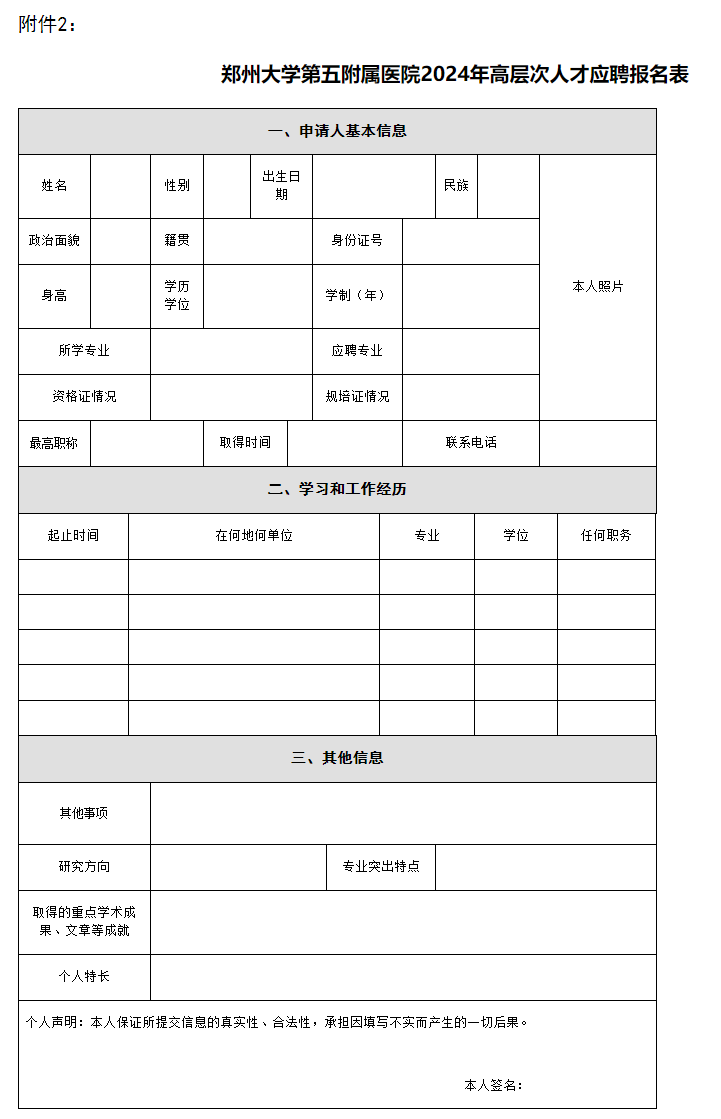 (2)《鄭州大學(xué)第五附屬醫(yī)院2024年應(yīng)聘報名表》word版;