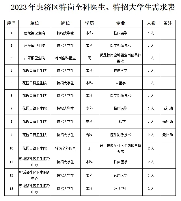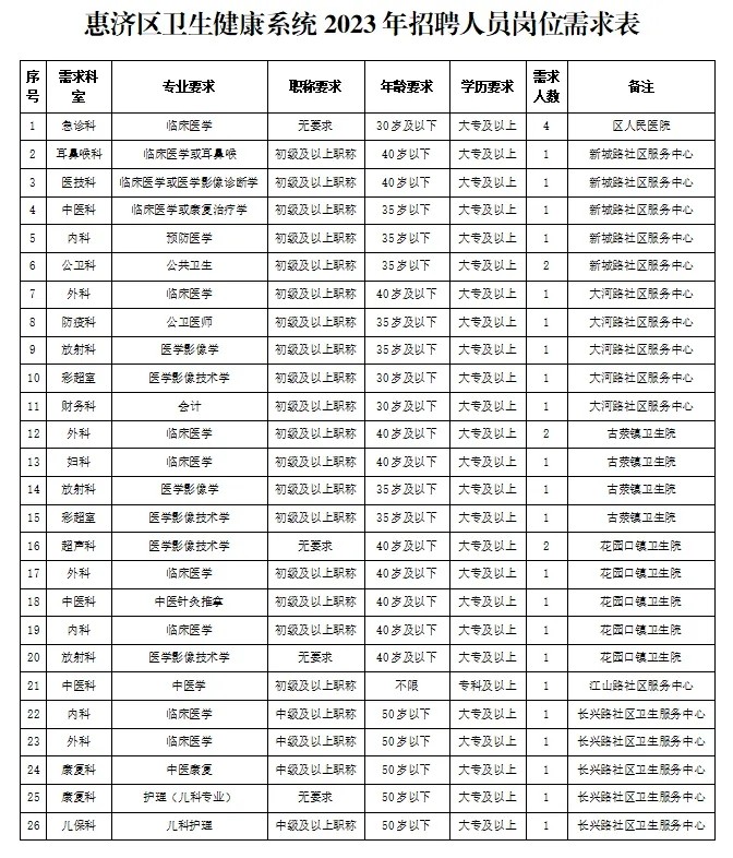 崗位、學(xué)歷、專業(yè)、職稱等資格條件見《2023年鄭州市惠濟(jì)區(qū)衛(wèi)生健康系統(tǒng)引進(jìn)人才崗位需求表》(附件1)、《2023年惠濟(jì)區(qū)特崗全科醫(yī)生、特招大學(xué)生需求表》(附件2)。