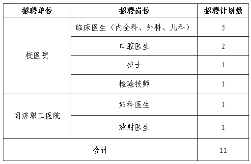 非應(yīng)屆人員應(yīng)為統(tǒng)招本科及以上學(xué)歷,具有醫(yī)師資格證書(shū),中級(jí)及以上專業(yè)技術(shù)職稱。中級(jí)職稱者不超過(guò)40周歲(1983年4月1日之后出生),高級(jí)職稱者不超過(guò)45周歲(1978年4月1日之后出生)。校醫(yī)院醫(yī)生應(yīng)聘人員需4年以上三級(jí)醫(yī)院工作經(jīng)歷。同濟(jì)職工醫(yī)院有二級(jí)以上綜合性醫(yī)院5年工作經(jīng)驗(yàn)者優(yōu)先。