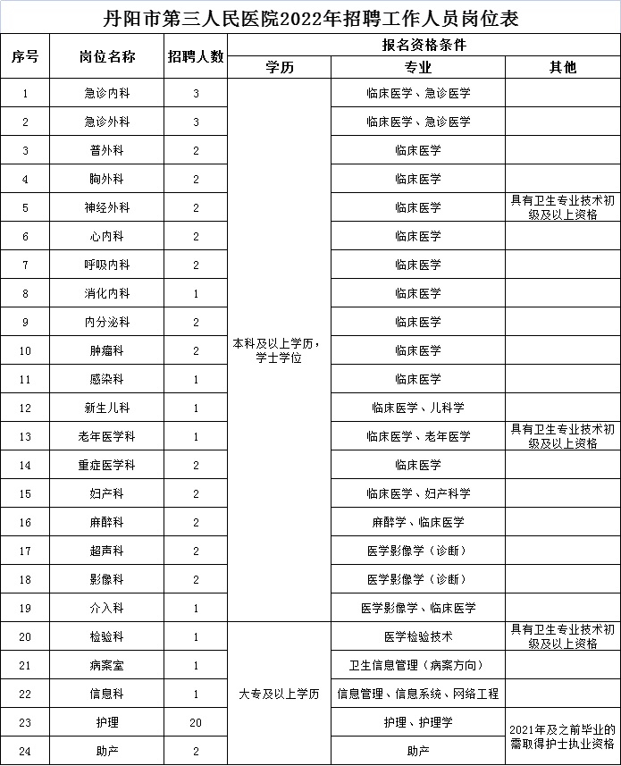 7、招聘崗位、人數(shù)和所要求的學(xué)歷、專業(yè)等資格條件詳見《丹陽(yáng)市第三人民醫(yī)院2022年招聘工作人員崗位表》。