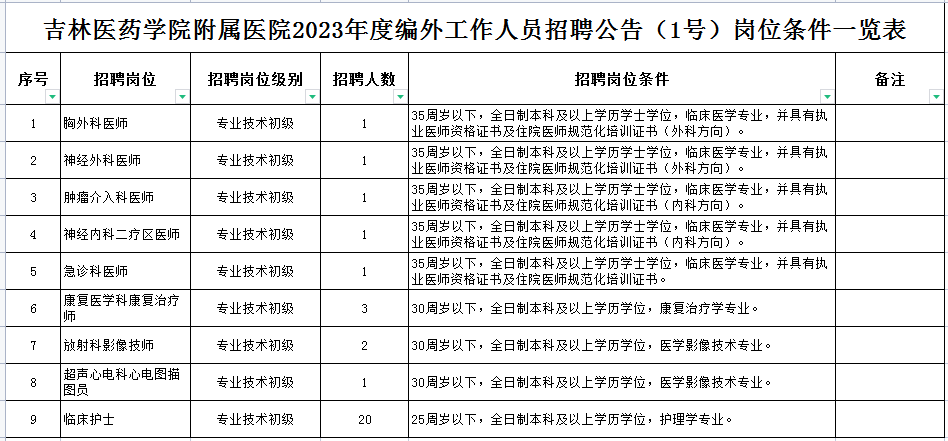 本次招聘編外工作人員崗位:胸外科醫(yī)師、神經外科醫(yī)師、腫瘤介入科醫(yī)師、神經內科二療區(qū)醫(yī)師、急診科醫(yī)師、康復醫(yī)學科康復治療師、放射科影像技師、超聲心電科心電圖描圖員和臨床護士。招聘條件詳見附件:《吉林醫(yī)藥學院附屬醫(yī)院2023年度編外工作人員招聘公告(1號)崗位條件一覽表》。