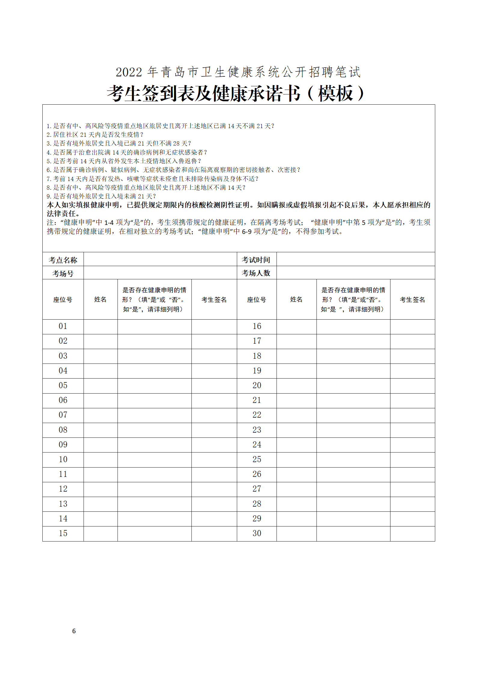 4.考試期間,監(jiān)考人員將組織全體考生簽訂《考生簽到表及健康承諾書(shū)》(考點(diǎn)提供,樣式見(jiàn)附件),請(qǐng)考生提前了解健康承諾書(shū)內(nèi)容,按要求如實(shí)簽訂。