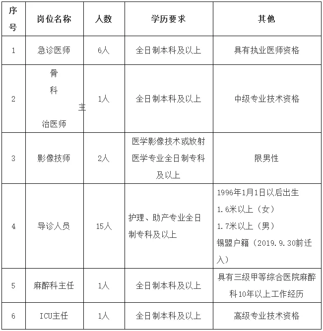 現(xiàn)根據(jù)醫(yī)院工作需要,面向社會(huì)公開招聘專業(yè)技術(shù)人員,其中急診科醫(yī)師6名,骨科主治醫(yī)師1名,影像技師2名,導(dǎo)診人員15名,麻醉科主任1名,ICU主任1名,具體事項(xiàng)公告如下: