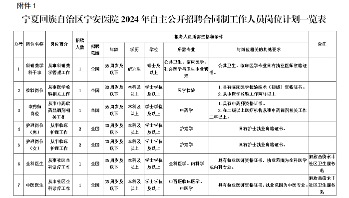 1.寧夏回族自治區(qū)寧安醫(yī)院2024年自主公開招聘合同制工作人員崗位計劃一覽表