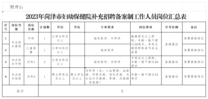 詳見《2023年菏澤市婦幼保健院補充招聘備案制工作人員崗位匯總表》(附件1)。