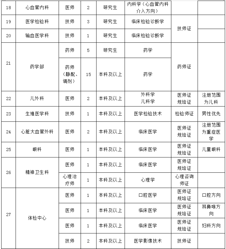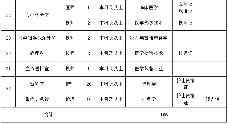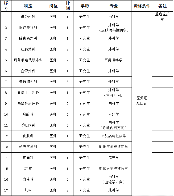 3、年齡要求:神經(jīng)內(nèi)科重癥監(jiān)護(hù)室、醫(yī)療美容科1990年1月1日以后出生,其余崗位1993年1月1日以后出生。
