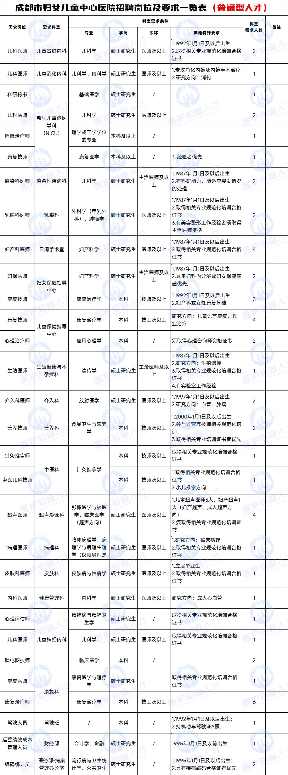 具體招聘崗位及要求,詳見(jiàn)《成都市婦女兒童中心醫(yī)院招聘崗位及要求一覽表》。